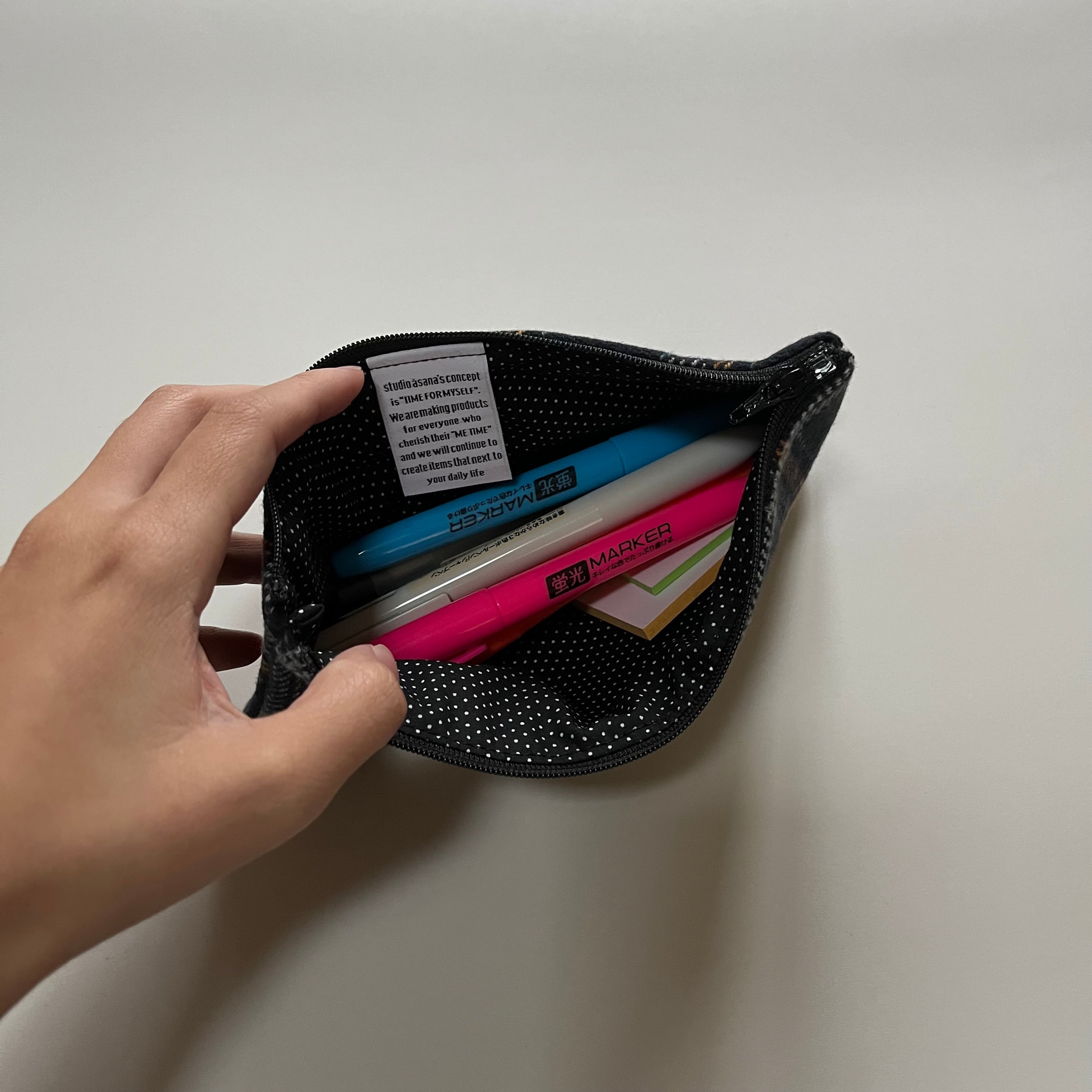 コットンツイードのペンケース。裏地はドット柄。